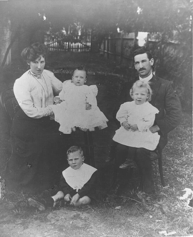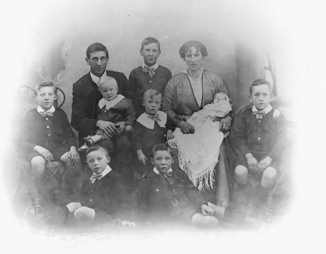 Grigg-Family-1916: This has Bert, George, Ken, Bob, Harold, Tom, Arthur and Sylvia with Grandma and first husband (Grandma at 31 years old).